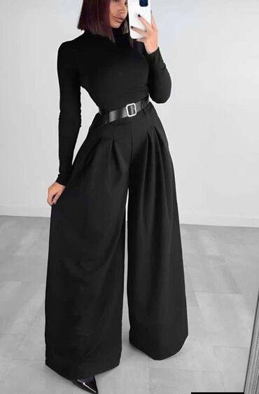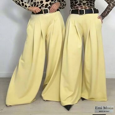 - Model: ultra široke nogavice (palazzo), visoki struk, više dubokih falti sa prednje strane za elegantan volumen i lep pad.