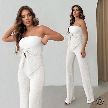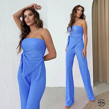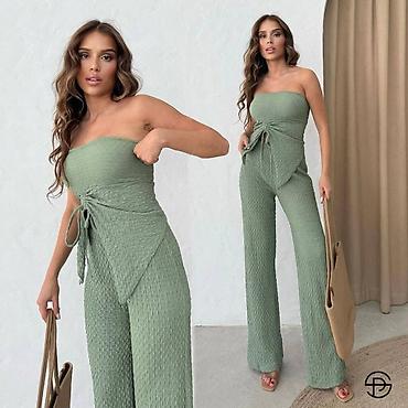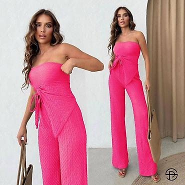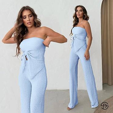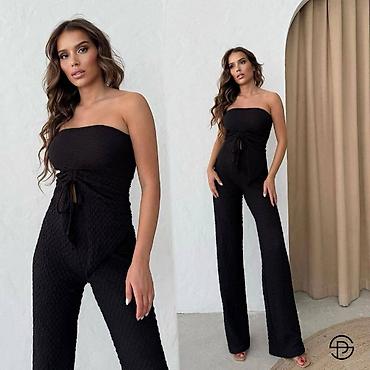 Ženski jednobojni komplet bez bretela, od elastičnog rebrasto-teksturisanog materijala. Gornji deo je bandeau kroja sa dekorativnim preklopom i vezivanjem u struku, koje formira asimetričan panel napred i naglašava siluetu. Donji deo su duže ravne nogavice sa laganim padom. Dizajn je minimalistički i elegantan, pogodan za dnevne i večernje prilike.