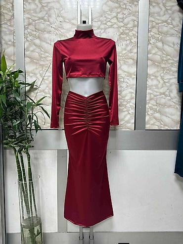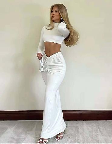 - Elegantni ženski komplet sastavljen od kratkog topa dugih rukava i uske maxi suknje.