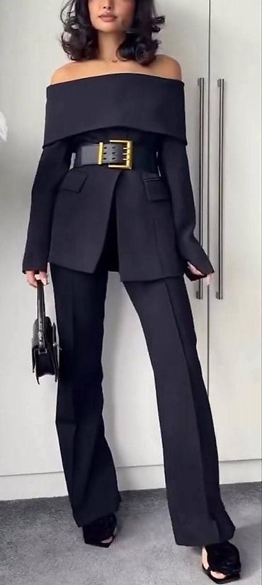 - Dizajn: moderan komplet sa sakoom koji se nosi spušteno preko ramena (off-shoulder) i pantalonama ravnog kroja sa prednjim peglanim faltama.