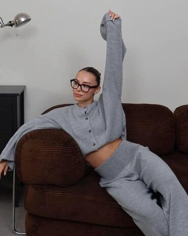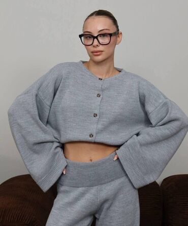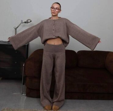 - Dvodijelni set od mekanog pletiva: kratki kardigan na kopčanje i ravne, široke pantalone sa visokim, elastičnim pojasom.