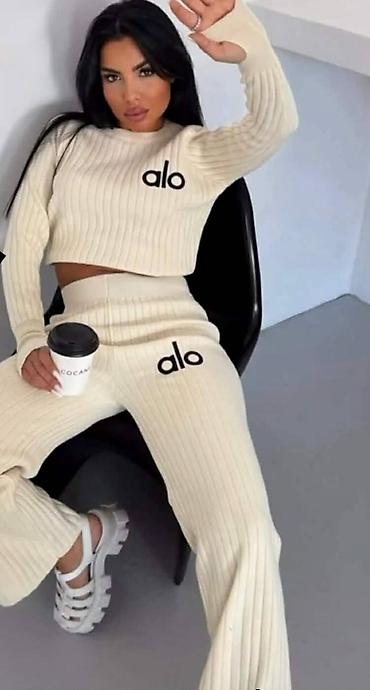 - Donji dio: visoki struk sa elastičnim pojasom, ravna/šira nogavica, “alo” logo na butini