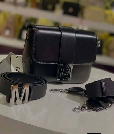 Elegantna ženska torbica preko ramena sa metalnim slovom „M” na preklopu.