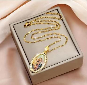 - Medaljon: ovalni privesak sa slikom Bogorodice sa Detetom, zaštićen staklenim ili providnim slojem.
