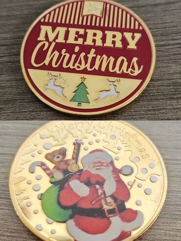 - Dekorativne metalne medalje sa božićnim motivima: Deda Mraz, irvasi, saonice, jelke, pahulje, „Merry Christmas“ natpisi i praznične zvezde.