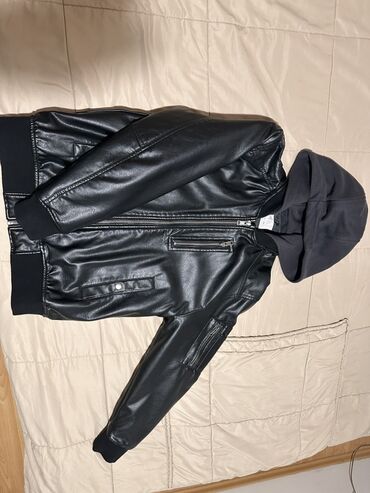 - Model: bomber/majica-jakna izgled, crna “eko-koža” sa tekstilnom tamnosivom kapuljačom