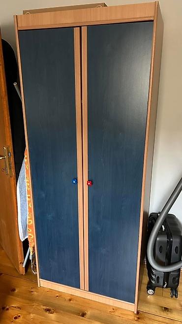 - Materijal: oplemenjena iverica u kombinaciji svetlog drvenog dekora i tamnoplavih frontova.