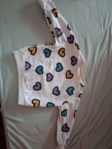 - Dukserica sa dugim rukavima u beloj boji sa šarenim srcima (ljubičasta, tirkizna, narandžasta). Rebraste ranfle na rukavima, oko vrata i na donjem rubu.