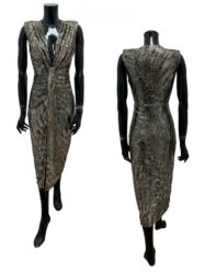 Ženska haljina na bretele, midi dužine, sa floralnim printom u nijansama zelene, bež i smeđe.Gornji deo ima oblikovane korpice i uske bretele. Materijal je lagan i blago rastegljiv, prijatan za le...