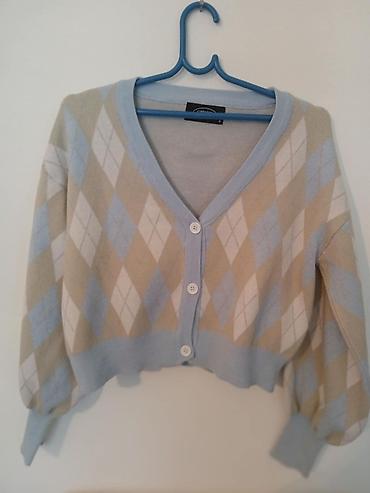 Kao nova CIDER kardigan, veličina S. Kratak model sa dubokim V-izrezom i kopčanjem na četiri bele dugmadi. Argyle (romb) dezen u pastelnim tonovima svetloplave, bež i bele. Rebrasti porub, manžete i ivica oko izreza u svetloplavoj boji. Mekan, pleteni materijal prijatan za svakodnevno nošenje i slojevito kombinovanje. Savršen uz farmerke, suknje ili preko haljine za preppy/klasičan izgled.