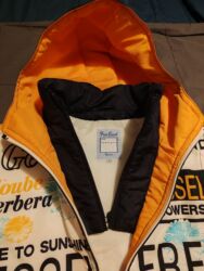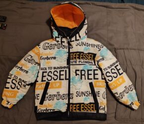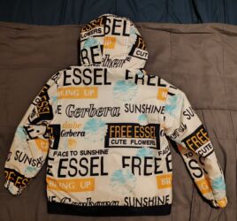 Dečija jakna sa kapuljačom – šarena štampa “FREE ESSEL / Gerbera / Sunshine” sa plavim cvetovima i detaljima u crnoj i narandžastoj boji.