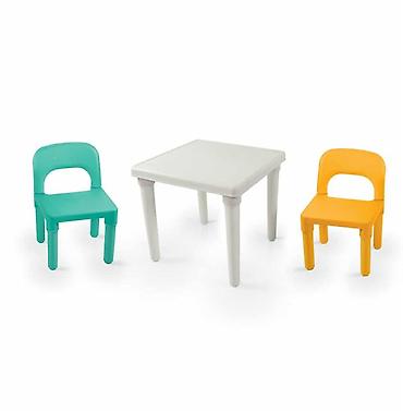 - Set sadrži: 1 kvadratni sto (bela boja) + 2 stolice (žuta i tirkizna)
