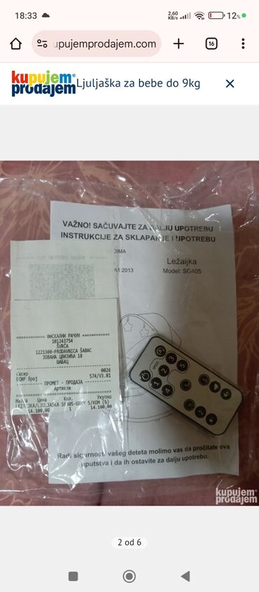 U kompletu: ljuljaška sa bazom, uložak/sedište sa sigurnosnim pojasom, mrežasta zaštita, nadsjenka, daljinski upravljač, uputstvo za upotrebu. Model u uputstvu označen kao SG405. Idealno za smirivanje i uspavljivanje bebe do 9 kg.