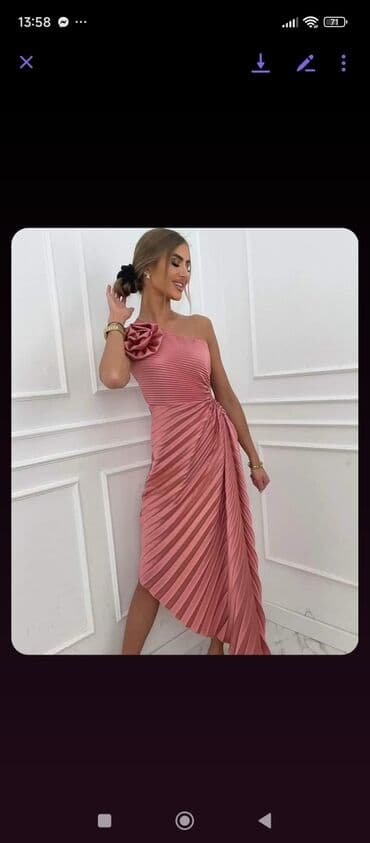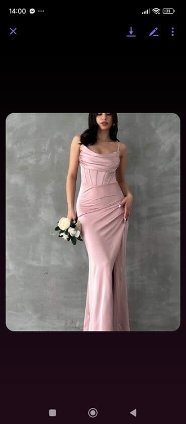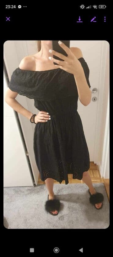 Elegantna večernja haljina – crna, duga, sa dramatičnim šlepom i visokim šlicem. - Kroj: sirena/suknja sa naborima napred, visoki otvor na butini, produženi asimetrični šlep sa strane. - Gornji de...