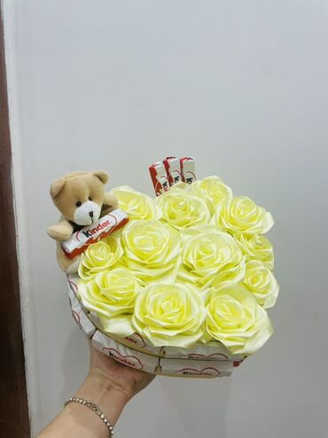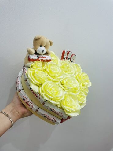 Napomena: Sadržaj vidljiv na fotografijama – satenske ruže, Kinder čokoladice oko kutije i plišani meda. Idealno za ljubitelje Kinder slatkiša i nežnih poklona.