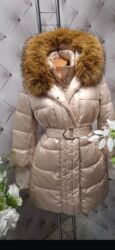 Ženska zimska jakna sa krznenom kapuljačom - Model: duža, topla puffer jakna sa pojasom za struk naglašene siluete - Kapuljača: velika, duboka, sa bogatim krznenim obodom; kapuljača je podesiva i ...