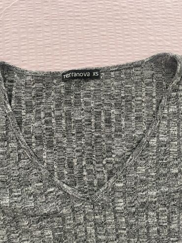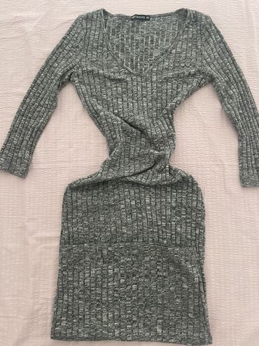 Terranova haljina, veličina XS. Siva, melirana pletena tkanina sa izraženom rebrastom teksturom. V-izrez, duži rukavi (oko 3/4 do punih), uska silueta koja prati liniju tela, dužina iznad kolena. Mekan i elastičan materijal prijatan za kožu, pogodan za svakodnevne i večernje kombinacije uz patike, čizme ili štikle. Neutralna boja laka za uklapanje sa jaknama, kardiganima i kaputima. Etiketa “Terranova XS” vidljiva na unutrašnjem delu izreza. Idealno za jesen/zimu i prelazne sezone.