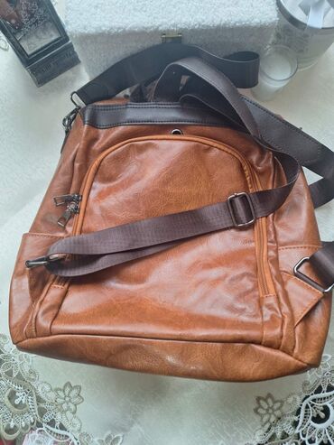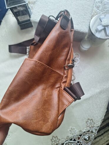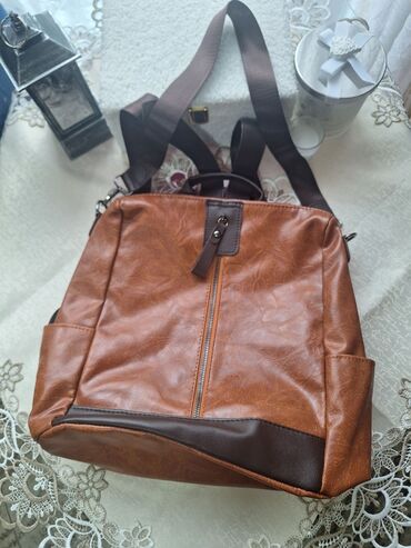 BraonUniseks ranac/torba od eko-kože u konjak braon boji sa tamno braon detaljima.