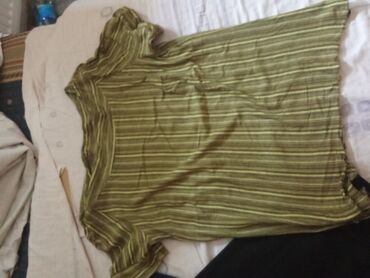 Ženska bluza kratkih rukava sa prugastim dezenom. Dominantna maslinasto zelena boja je kombinovana sa svetlijim prugama. Bluza ima okrugli izrez i volan na rukavima, što joj daje ženstven izgled. Idealan izbor za svakodnevne aktivnosti i opuštene kombinacije.