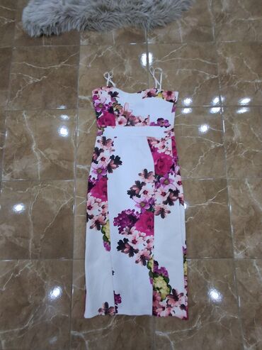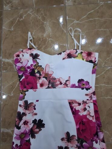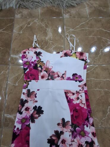 Ženska haljina na bretele, midi dužine, elegantnog kroja koji prati liniju tela. Osnova je bela, sa upečatljivim floralnim printom u nijansama fuksije, ružičaste, ljubičaste, zelene i braon. Gornji deo ima blagi srcoliki izrez i uske, podesive tanke bretele. U struku je široka traka koja vizuelno sužava siluetu, a paneli sa printom sa strane i po sredini stvaraju efekat izdužene figure. Materijal je gladak i kompaktniji, sa blagim sjajem, prijatan za letnje i svečane prilike. Idealna za svadbe, koktele, proslave ili letnje večernje izlaske.