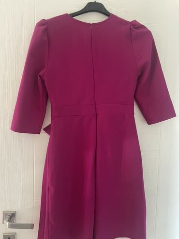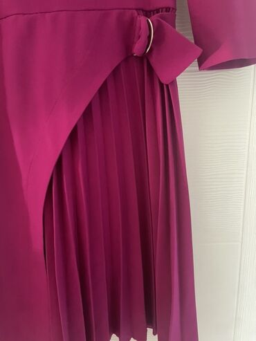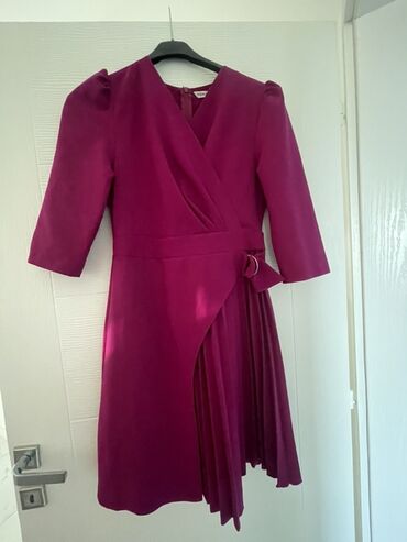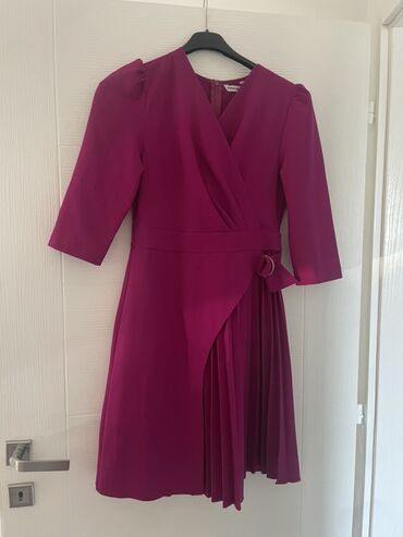 Elegantna fuksija haljina sa preklopom i asimetričnim detaljem.