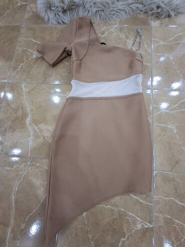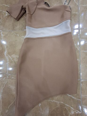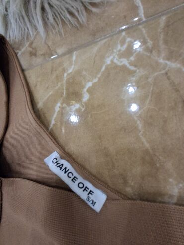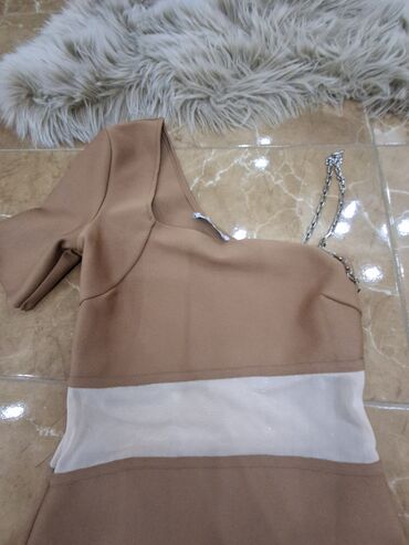 - Boja: topla bež/karamel sa belim providnim pojasom u struku
