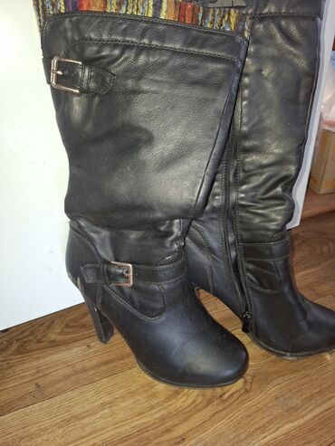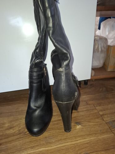 Ženske čizme do kolena u crnoj boji sa visokom štiklom. Dizajn čizama
