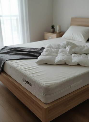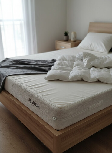 Fotografije prikazuju originalni WELLPUR logo na bočnoj strani i detalje navlake sa rajsferšlusom. Idealno rešenje za udoban i miran san.
