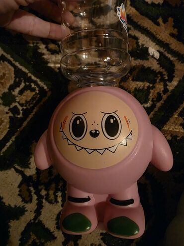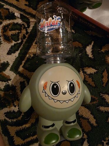 - Slatki stojeći dozator u obliku malog lika, sa providnim rezervoarom na vrhu (nalepnica “Water dispenser”).