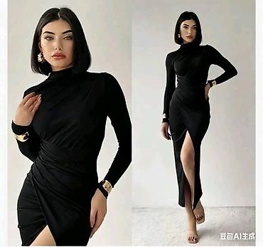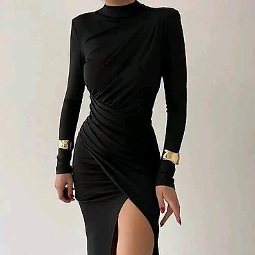 Elegantna duga haljina sa ramenima otkrivenim (“off‑shoulder”) dizajnom. - Kroj: uska silueta koja prati liniju tela, visoki prorez sa asimetričnom draperijom sa jedne strane. - Dužina: maxi. - De...