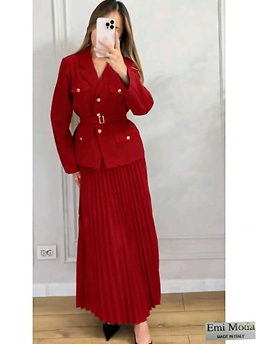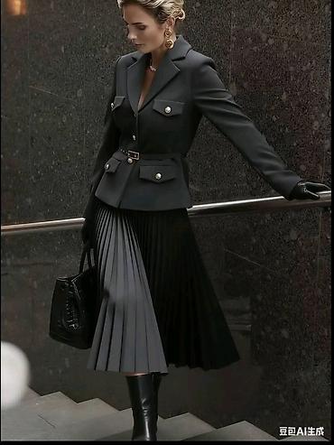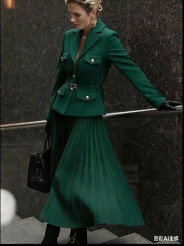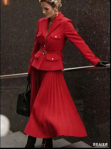 Ženski komplet – kratki sako, plisirana mini suknja i top - Dizajn: elegantan kroj sa čistim linijama; kratki sako sa dugim rukavima i V-otvorenjem, krojen da lagano prati struk. Suknja je A-kroja...