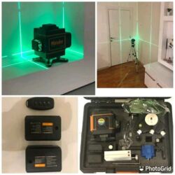 Paket sadrži: laserski nivelator Kzubr 3x360°, 2x punjiva baterija, punjač/kabl, magnetni nosač, podesivo postolje, dodatni nosači i elementi za fino podešavanje, zaštitne naočare, transportni kofer.