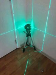 - Projekcija 3 x 360° zelenih laserskih linija: dve vertikalne i jedna horizontalna za precizno nivelisanje, poravnanje i trasiranje u svim pravcima.