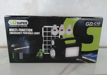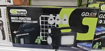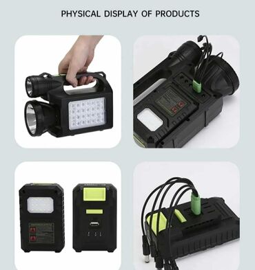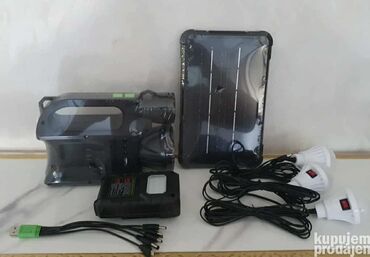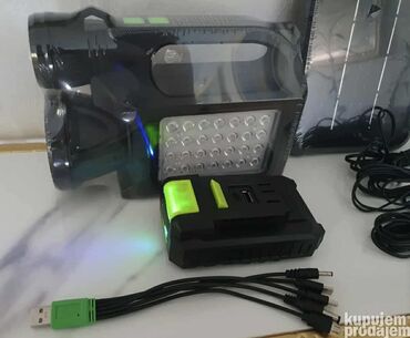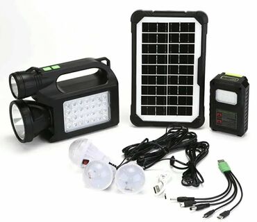 U paketu: glavna LED lampa, solarni panel, power bank/mini reflektor, 2 LED sijalice sa kablovima, višenamenski punjački kabl sa nastavcima.
