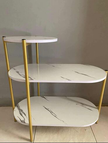 - Dizajn: moderni, asimetrični troslojni sto sa ovalnim policama i okrugnim gornjim nivoom