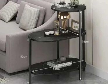 - Dimenzije (približno prema prikazu): visina 78 cm; donja polica dužina 65 cm; srednja polica 46 cm; gornja polica prečnik 45 cm; visina naslona kreveta/sofe 52 cm prikazana radi orijentacije
