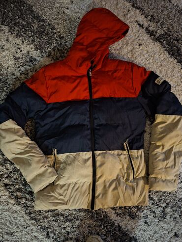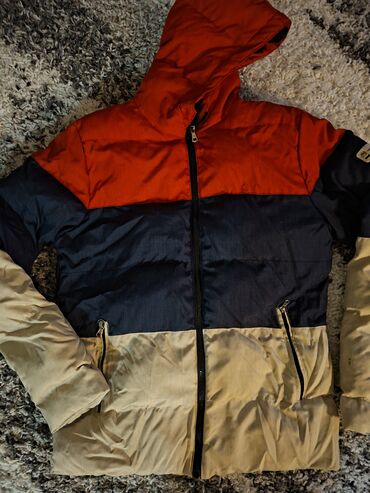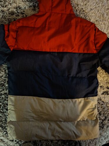 Zimska jakna sa kapuljačom, troslojni „color-block” dizajn: - Boje: gornji deo bež, srednji deo maslinasto‑zelen, donji deo tamnocrven/bordo - Punjenje tipa puffer za dobru termoizolaciju - Zatvara...