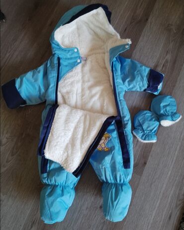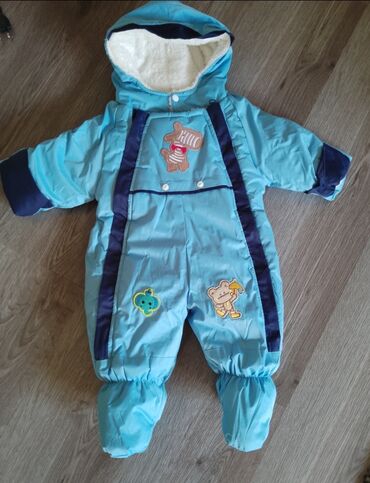 Jednodelni dečiji skafander u svetloplavoj boji sa tamnoplavim akcentima, pogodan za zimske dane. Skafander je postavljen belim mekanim krznom i ima kapuljaču za dodatnu zaštitu od hladnoće. Prednja strana je ukrašena dečijim aplikacijama u obliku medvedića i oblaka. Zatvaranje je na dva reda dugmadi i rajsferšlus, što omogućava lako oblačenje i svlačenje. Uključene su i rukavice u istoj boji, sa krznenom postavom, koje se mogu pričvrstiti za skafander. Donji deo skafandera je zatvoren, sa integrisanim navlakama za stopala, a na krajevima rukava se nalaze ranfle za bolje zadržavanje toplote. Idealan je za igru na snegu i boravak napolju tokom hladnih meseci.