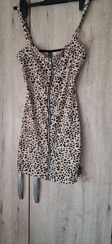 H&M mini haljina sa animal printom (leopard). Model na bretele, kroj uz telo. Podesive naramenice. Prednji deo sa punim rajsferšlusom duž cele dužine – lako oblačenje i mogućnost podešavanja dekoltea. Blago oblikovan grudni deo za lepšu siluetu. Elastična, mekana tkanina prijatna na koži. Dužina mini, modernog i ženstvenog izgleda, idealna za večernje izlaske i posebne prilike. Boja: bež podloga sa tamnim leopard šarama.
