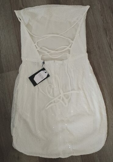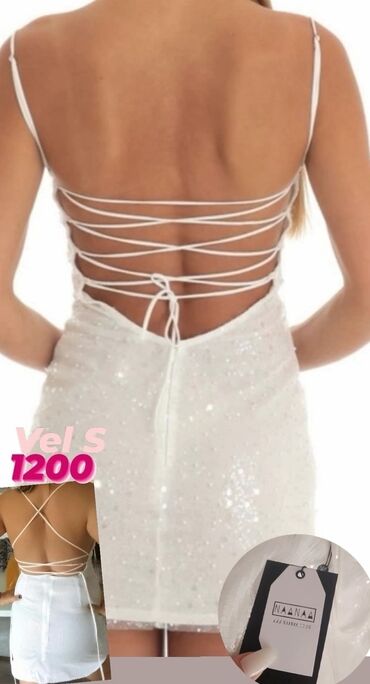 Bela haljina sa tankim bretelama i otvorenim leđima sa ukrštenim vezivanjem. Haljina je pripijena uz telo, dužine iznad kolena. Idealna je za večernje izlaske i posebne prilike.