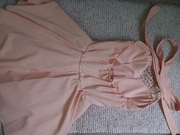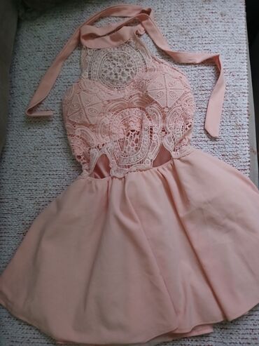 Haljina bez rukava u puder-ružičastoj boji, A-kroja sa lepršavom suknjom do iznad kolena. Gornji deo je izrađen od dekorativne čipke sa bogatim geometrijskim motivima i prozirnim detaljima, sa visokim izrezom. Vezivanje oko vrata trakama u istoj boji omogućava podešavanje širine i lep pad leđa. Struk je blago naboran sa elastičnim delom radi udobnosti i bolje forme. Idealna za proslave, letnje izlaske i sve svečane prilike.