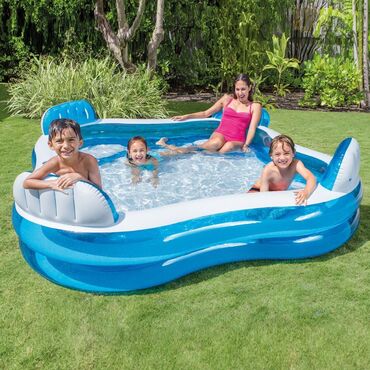 Cetvorougaonog oblika, porodični bazen za dvorište Bestway Family Fun ima 4 mesta za sedenje ("stolice" koje se takođe naduvavaju) sa naslonima za glavu.