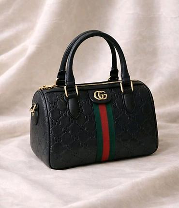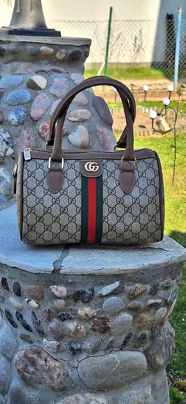 - Dizajn: kompaktan poluokrugli oblik, prepoznatljiva srednja pruga u zeleno‑crvenoj kombinaciji, monogram uzorak po celoj površini i metalni GG detalj sprijeda.