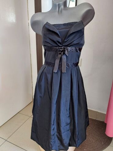 - Model 1: Midi koktel haljina bez bretela. Struk naglašen satenskim pojasom sa dekorativnom mašnom napred. Nabori na korpulentu i suknji stvaraju volumen i profinjenu siluetu. Zatvaranje i postava nisu vidljivi na fotografijama; gornji deo strukiran, suknja blago A-kroja.