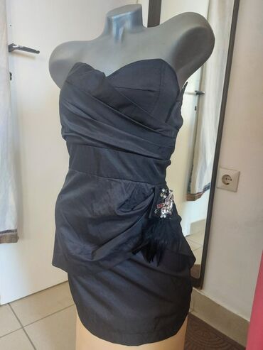 - Model 3: Mini haljina bez bretela, drapirana preko grudi i bokova za efekat umotavanja. Sa strane ukrasna broška sa kristalima i crnim perjem. Naglašava struk i ističe liniju tela; modernog, svečanog karaktera.