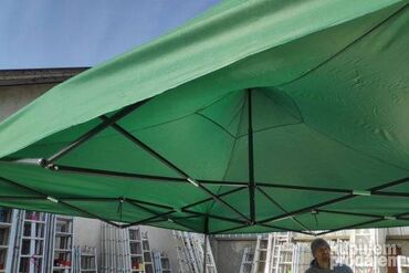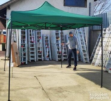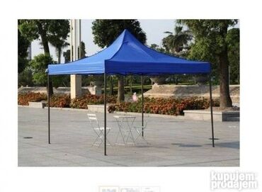 Potpuno NOV paviljon, dimenzija 3x3 metra cm, vrhunskog kvaliteta. Napravljen je od metala i poliestera, tako da je vodootporan, a moze se vrlo lako sklopiti, jer ima "harmonika" mehanizam. Konstrukcija je naravljena od debelozidnih cevi, tako da je paviljon gotovo neuništiv. Krov je dostupan u 4 boje: krem, zelenoj, crvenoj i plavoj.