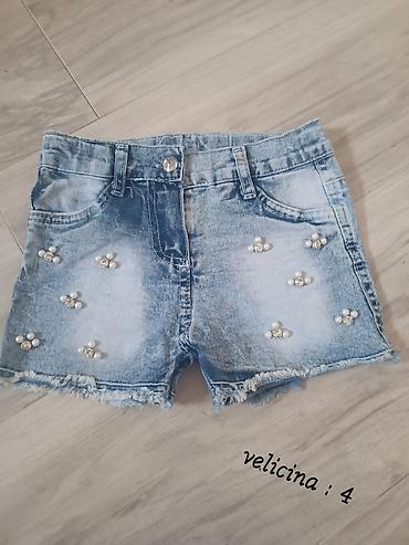- Teksas šorts za devojčice, svetlo plavi “washed” efekat, ukrašen biserima i sitnim cirkonima u obliku cvetića sprijeda. Pojas sa petljama za kaiš, klasično kopčanje na dugme i rajsferšlus, prednji i zadnji džepovi. Kratke nogavice sa blago iskrzanim rubom. Veličina: 4.