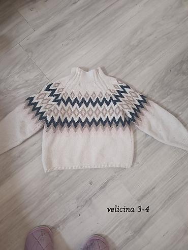 - Pleteni džemper dugih rukava sa visokim polurol-okruglim izrezom i nordijskim/zig-zag šarama u tamnoplavoj i puder nijansi preko svetle osnove. Topao i mekan, pogodan za slojevito oblačenje. Veličina: 3–4.