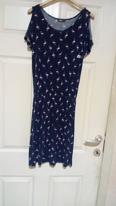 4) Tamnoplava haljina sa kratkim rukavima i izrezom u obliku slova V na leđima/ramenima. Celom površinom sitan print roze flamingosa, elastičan struk, mekana rastegljiva tkanina, dužina do kolena.
