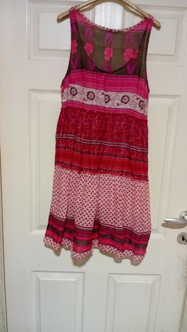 3) Letnja haljina bez rukava u nijansama roze i crvene. Gornji deo sa poluprozirnom mrežicom i cvetnim motivom, suknja u više horizontalnih pruga i šara, lepršav kroj, dužina iznad kolena.